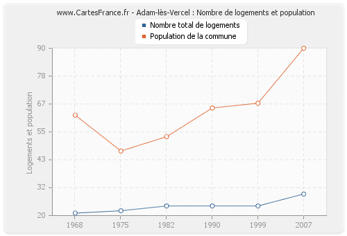 Historique du nombre de logements d'Adam-lès-Vercel de 1968 à 2007 :