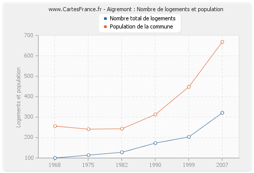 La population d'Aigremont était de 668 habitants en 2007, 448 habitants en 1999, 313 habitants en 1990, 243 habitants en 1982, 241 habitants en 1975 et 256 habitants en 1968. Parallèlement, le nombre de logements d'Aigremont était de 321 en 2007, 203 en 1999, 173 en 1990, 128 en 1982, 114 en 1975 et 100 en 1968.