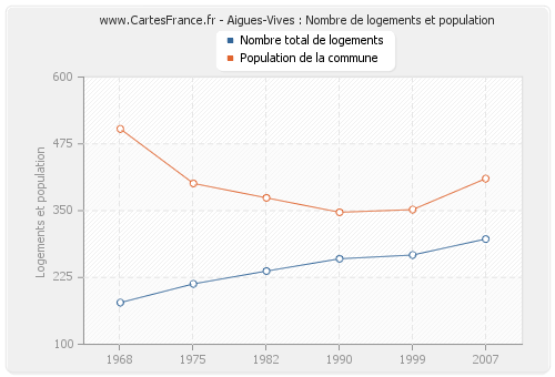 La population d'Aigues-Vives était de 410 habitants en 2007, 352 habitants en 1999, 347 habitants en 1990, 374 habitants en 1982, 401 habitants en 1975 et 503 habitants en 1968. Parallèlement, le nombre de logements d'Aigues-Vives était de 297 en 2007, 267 en 1999, 260 en 1990, 237 en 1982, 213 en 1975 et 178 en 1968.