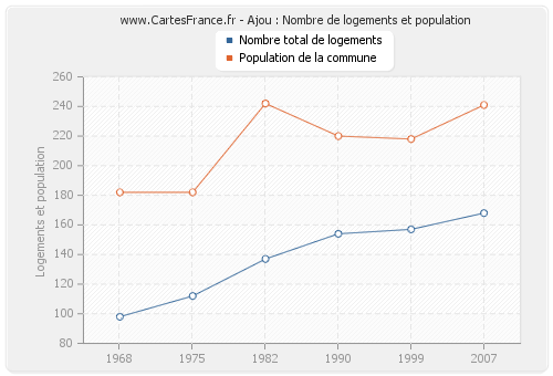 La population d'Ajou était de 241 habitants en 2007, 218 habitants en 1999, 220 habitants en 1990, 242 habitants en 1982, 182 habitants en 1975 et 182 habitants en 1968. Parallèlement, le nombre de logements d'Ajou était de 168 en 2007, 157 en 1999, 154 en 1990, 137 en 1982, 112 en 1975 et 98 en 1968.