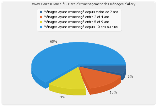 - Nombre de ménages d'Allery ayant emménagé depuis 10 ans ou plus : 194