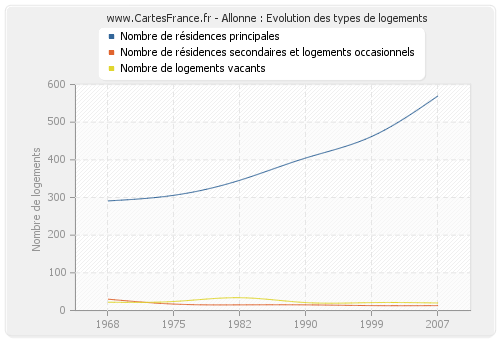 Les graphiques suivant reprennent l'historique du nombre et du type de logements d'Allonne de 1968 à 2007. Le deuxième graphique est tracé en interpolation cubique. Ceci permet d'obtenir plus précisément le nombre de logement du village d'Allonne les années ou aucun recensement n'a été effectué.
