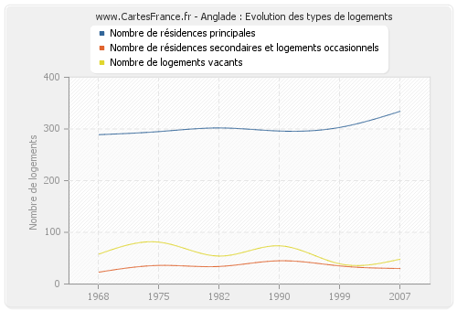 Les graphiques suivant reprennent l'historique du nombre et du type de logements d'Anglade de 1968 à 2007. Le deuxième graphique est tracé en interpolation cubique. Ceci permet d'obtenir plus précisément le nombre de logement du village d'Anglade les années ou aucun recensement n'a été effectué.