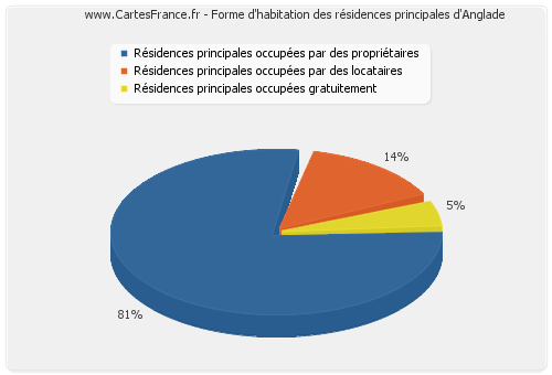 Le Village d'Anglade recensait la même année un total de 334 ménages. Les graphiques suivants présentent les statistiques d'habitation de ces ménages d'Anglade.