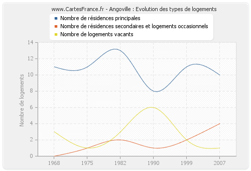 En 2007 les logements d'Angoville étaient composés de 10 résidences principales, 4 résidences secondaires ou occasionnels ainsi que 1 logements vacants.