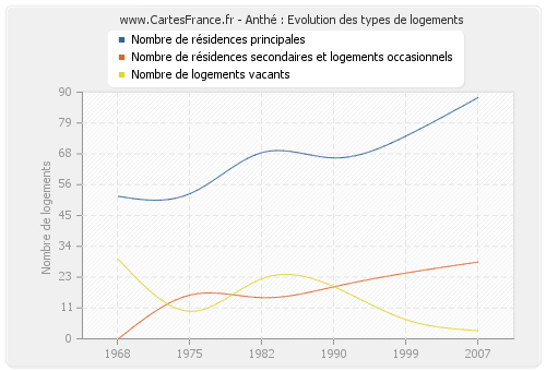 Les graphiques suivant reprennent l'historique du nombre et du type de logements d'Anthé de 1968 à 2007. Le deuxième graphique est tracé en interpolation cubique. Ceci permet d'obtenir plus précisément le nombre de logement du village d'Anthé les années ou aucun recensement n'a été effectué.