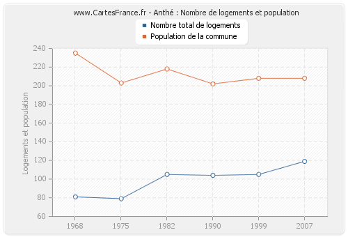 La population d'Anthé était de 208 habitants en 2007, 208 habitants en 1999, 202 habitants en 1990, 218 habitants en 1982, 203 habitants en 1975 et 235 habitants en 1968. Parallèlement, le nombre de logements d'Anthé était de 119 en 2007, 105 en 1999, 104 en 1990, 105 en 1982, 79 en 1975 et 81 en 1968.