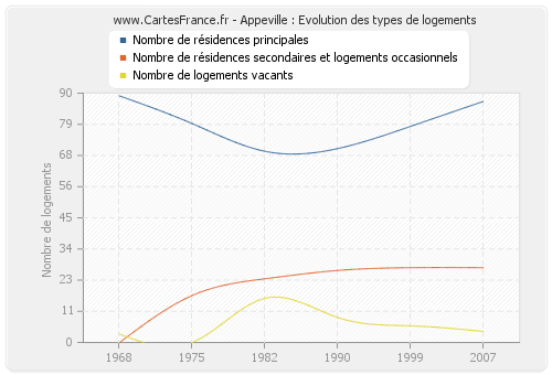 Les graphiques suivant reprennent l'historique du nombre et du type de logements d'Appeville de 1968 à 2007. Le deuxième graphique est tracé en interpolation cubique. Ceci permet d'obtenir plus précisément le nombre de logement du village d'Appeville les années ou aucun recensement n'a été effectué.