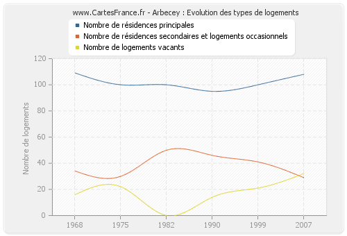 Les graphiques suivant reprennent l'historique du nombre et du type de logements d'Arbecey de 1968 à 2007. Le deuxième graphique est tracé en interpolation cubique. Ceci permet d'obtenir plus précisément le nombre de logement du village d'Arbecey les années ou aucun recensement n'a été effectué.