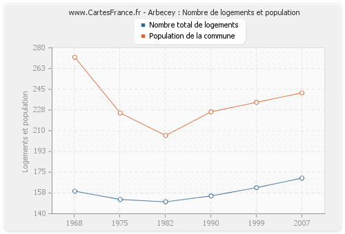 La population d'Arbecey était de 242 habitants en 2007, 234 habitants en 1999, 226 habitants en 1990, 206 habitants en 1982, 225 habitants en 1975 et 272 habitants en 1968. Parallèlement, le nombre de logements d'Arbecey était de 170 en 2007, 162 en 1999, 155 en 1990, 150 en 1982, 152 en 1975 et 159 en 1968.