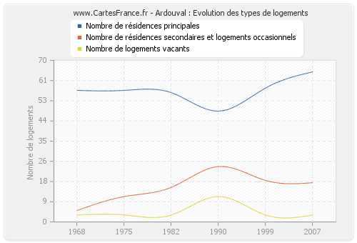 Les graphiques suivant reprennent l'historique du nombre et du type de logements d'Ardouval de 1968 à 2007. Le deuxième graphique est tracé en interpolation cubique. Ceci permet d'obtenir plus précisément le nombre de logement du village d'Ardouval les années ou aucun recensement n'a été effectué.