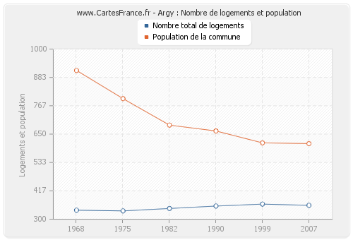 La population d'Argy était de 611 habitants en 2007, 614 habitants en 1999, 663 habitants en 1990, 687 habitants en 1982, 796 habitants en 1975 et 912 habitants en 1968. Parallèlement, le nombre de logements d'Argy était de 357 en 2007, 362 en 1999, 354 en 1990, 344 en 1982, 334 en 1975 et 337 en 1968.