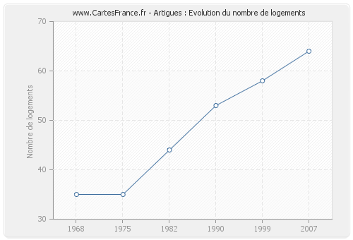 Le nombre de logements d'Artigues était de 64 en 2007, 58 en 1999, 53 en 1990, 44 en 1982, 35 en 1975 et 35 en 1968.