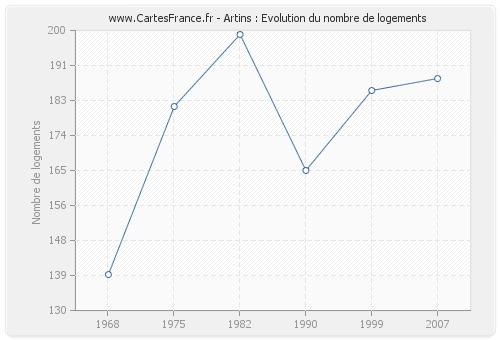 Le nombre de logements d'Artins était de 188 en 2007, 185 en 1999, 165 en 1990, 199 en 1982, 181 en 1975 et 139 en 1968.