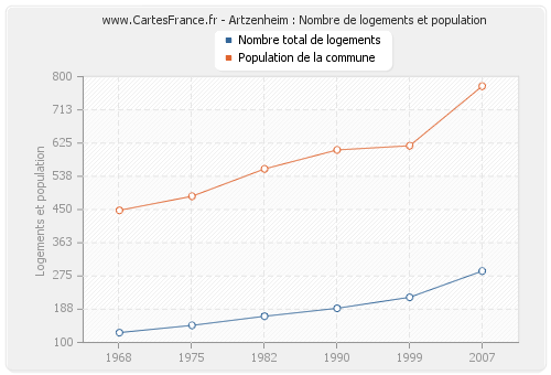 La population d'Artzenheim était de 775 habitants en 2007, 618 habitants en 1999, 607 habitants en 1990, 557 habitants en 1982, 485 habitants en 1975 et 448 habitants en 1968. Parallèlement, le nombre de logements d'Artzenheim était de 288 en 2007, 219 en 1999, 190 en 1990, 169 en 1982, 145 en 1975 et 126 en 1968.