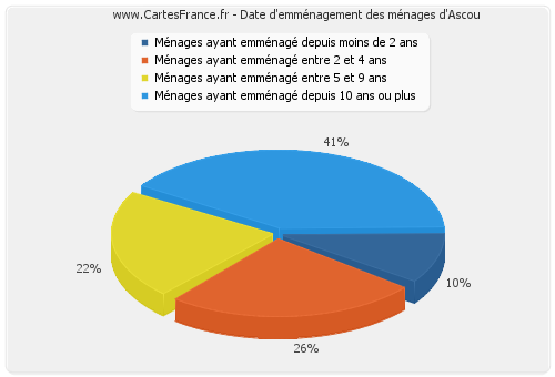 - Nombre de ménages d'Ascou ayant emménagé depuis 10 ans ou plus : 24