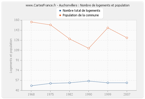 La population d'Auchonvillers était de 130 habitants en 2007, 147 habitants en 1999, 112 habitants en 1990, 128 habitants en 1982, 152 habitants en 1975 et 157 habitants en 1968. Parallèlement, le nombre de logements d'Auchonvillers était de 53 en 2007, 53 en 1999, 56 en 1990, 53 en 1982, 52 en 1975 et 48 en 1968.
