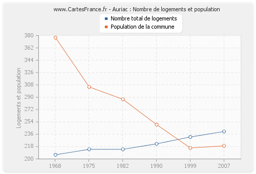La population d'Auriac était de 219 habitants en 2007, 216 habitants en 1999, 250 habitants en 1990, 287 habitants en 1982, 305 habitants en 1975 et 377 habitants en 1968. Parallèlement, le nombre de logements d'Auriac était de 240 en 2007, 232 en 1999, 222 en 1990, 214 en 1982, 214 en 1975 et 206 en 1968.
