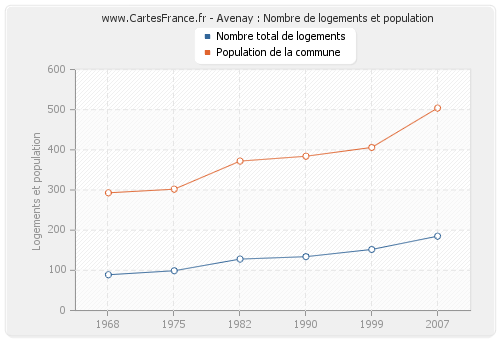 La population d'Avenay était de 504 habitants en 2007, 406 habitants en 1999, 384 habitants en 1990, 372 habitants en 1982, 302 habitants en 1975 et 293 habitants en 1968. Parallèlement, le nombre de logements d'Avenay était de 185 en 2007, 152 en 1999, 134 en 1990, 128 en 1982, 99 en 1975 et 89 en 1968.