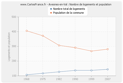 La population d'Avesnes-en-Val était de 281 habitants en 2007, 268 habitants en 1999, 291 habitants en 1990, 307 habitants en 1982, 372 habitants en 1975 et 406 habitants en 1968. Parallèlement, le nombre de logements d'Avesnes-en-Val était de 144 en 2007, 137 en 1999, 137 en 1990, 127 en 1982, 117 en 1975 et 107 en 1968.