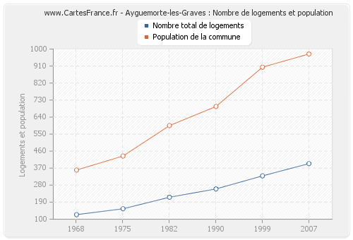 La population d'Ayguemorte-les-Graves était de 974 habitants en 2007, 904 habitants en 1999, 696 habitants en 1990, 595 habitants en 1982, 434 habitants en 1975 et 360 habitants en 1968. Parallèlement, le nombre de logements d'Ayguemorte-les-Graves était de 394 en 2007, 329 en 1999, 260 en 1990, 216 en 1982, 155 en 1975 et 124 en 1968.