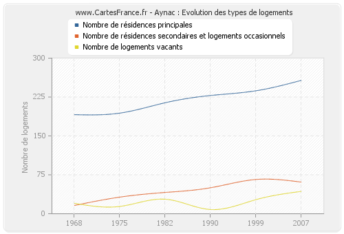 Les graphiques suivant reprennent l'historique du nombre et du type de logements d'Aynac de 1968 à 2007. Le deuxième graphique est tracé en interpolation cubique. Ceci permet d'obtenir plus précisément le nombre de logement du village d'Aynac les années ou aucun recensement n'a été effectué.
