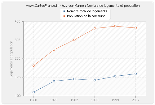 La population d'Azy-sur-Marne était de 374 habitants en 2007, 381 habitants en 1999, 372 habitants en 1990, 326 habitants en 1982, 286 habitants en 1975 et 222 habitants en 1968. Parallèlement, le nombre de logements d'Azy-sur-Marne était de 189 en 2007, 179 en 1999, 163 en 1990, 168 en 1982, 159 en 1975 et 115 en 1968.