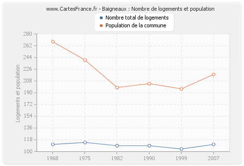 La population de Baigneaux était de 218 habitants en 2007, 196 habitants en 1999, 204 habitants en 1990, 198 habitants en 1982, 240 habitants en 1975 et 268 habitants en 1968. Parallèlement, le nombre de logements de Baigneaux était de 111 en 2007, 104 en 1999, 109 en 1990, 109 en 1982, 114 en 1975 et 111 en 1968.