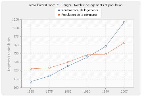 La population de Bangor était de 894 habitants en 2007, 742 habitants en 1999, 735 habitants en 1990, 637 habitants en 1982, 563 habitants en 1975 et 550 habitants en 1968. Parallèlement, le nombre de logements de Bangor était de 1 167 en 2007, 845 en 1999, 700 en 1990, 587 en 1982, 454 en 1975 et 380 en 1968.
