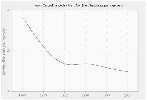 - Nombre d'habitants moyen par logement de Bar en 2007 : 1,48