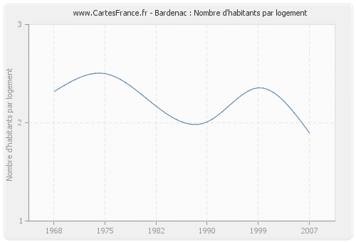 - Nombre d'habitants moyen par logement de Bardenac en 2007 : 1,90