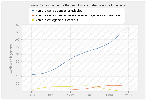 Les graphiques suivant reprennent l'historique du nombre et du type de logements de Bartrès de 1968 à 2007. Le deuxième graphique est tracé en interpolation cubique. Ceci permet d'obtenir plus précisément le nombre de logement du village de Bartrès les années ou aucun recensement n'a été effectué.