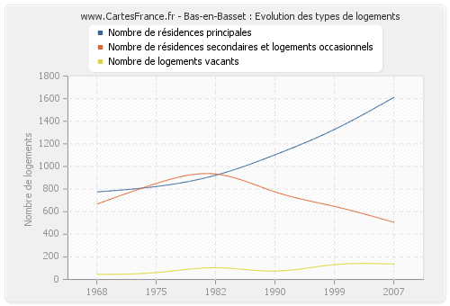 Les graphiques suivant reprennent l'historique du nombre et du type de logements de Bas-en-Basset de 1968 à 2007. Le deuxième graphique est tracé en interpolation cubique. Ceci permet d'obtenir plus précisément le nombre de logement de la ville de Bas-en-Basset les années ou aucun recensement n'a été effectué.