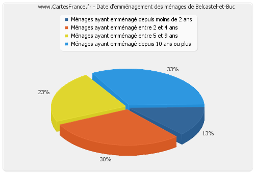 - Nombre de ménages de Belcastel-et-Buc ayant emménagé depuis 10 ans ou plus : 10