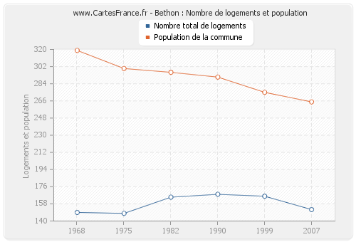 La population de Bethon était de 265 habitants en 2007, 275 habitants en 1999, 291 habitants en 1990, 296 habitants en 1982, 300 habitants en 1975 et 319 habitants en 1968. Parallèlement, le nombre de logements de Bethon était de 152 en 2007, 166 en 1999, 168 en 1990, 165 en 1982, 148 en 1975 et 149 en 1968.