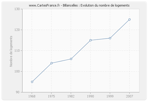 Le nombre de logements de Billancelles était de 125 en 2007, 116 en 1999, 115 en 1990, 106 en 1982, 104 en 1975 et 95 en 1968.