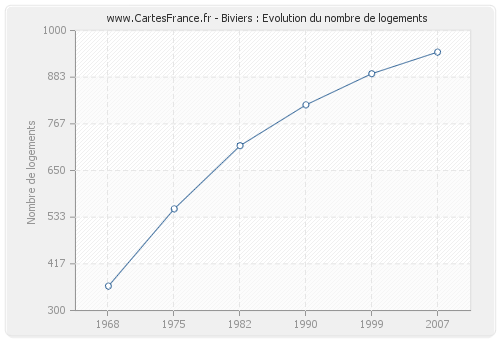Le nombre de logements de Biviers était de 946 en 2007, 892 en 1999, 814 en 1990, 712 en 1982, 554 en 1975 et 361 en 1968.