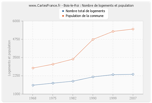 La population de Bois-le-Roi était de 5 452 habitants en 2007, 5 290 habitants en 1999, 4 744 habitants en 1990, 3 395 habitants en 1982, 3 044 habitants en 1975 et 2 782 habitants en 1968. Parallèlement, le nombre de logements de Bois-le-Roi était de 2 353 en 2007, 2 328 en 1999, 2 175 en 1990, 1 882 en 1982, 1 747 en 1975 et 1 607 en 1968.