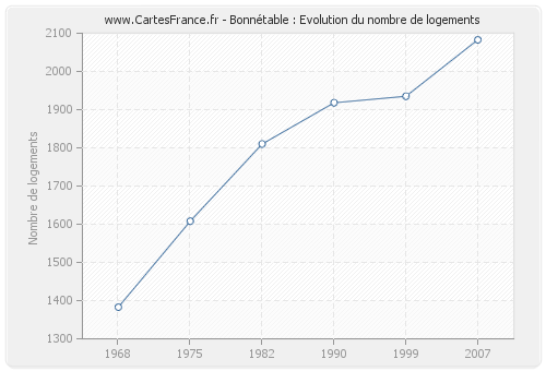 Le nombre de logements de Bonnétable était de 2 083 en 2007, 1 935 en 1999, 1 918 en 1990, 1 810 en 1982, 1 608 en 1975 et 1 383 en 1968.