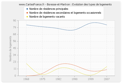 Les graphiques suivant reprennent l'historique du nombre et du type de logements de Boresse-et-Martron de 1968 à 2007. Le deuxième graphique est tracé en interpolation cubique. Ceci permet d'obtenir plus précisément le nombre de logement du village de Boresse-et-Martron les années ou aucun recensement n'a été effectué.