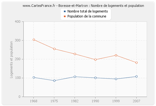 La population de Boresse-et-Martron était de 182 habitants en 2007, 221 habitants en 1999, 198 habitants en 1990, 228 habitants en 1982, 255 habitants en 1975 et 304 habitants en 1968. Parallèlement, le nombre de logements de Boresse-et-Martron était de 108 en 2007, 95 en 1999, 101 en 1990, 107 en 1982, 86 en 1975 et 103 en 1968.