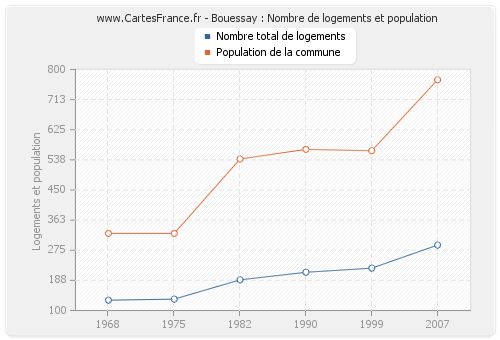 La population de Bouessay était de 770 habitants en 2007, 564 habitants en 1999, 568 habitants en 1990, 540 habitants en 1982, 324 habitants en 1975 et 324 habitants en 1968. Parallèlement, le nombre de logements de Bouessay était de 290 en 2007, 223 en 1999, 211 en 1990, 189 en 1982, 133 en 1975 et 130 en 1968.