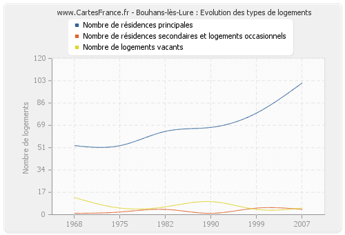 Les graphiques suivant reprennent l'historique du nombre et du type de logements de Bouhans-lès-Lure de 1968 à 2007. Le deuxième graphique est tracé en interpolation cubique. Ceci permet d'obtenir plus précisément le nombre de logement du village de Bouhans-lès-Lure les années ou aucun recensement n'a été effectué.