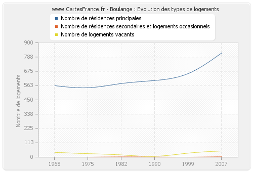 Les graphiques suivant reprennent l'historique du nombre et du type de logements de Boulange de 1968 à 2007. Le deuxième graphique est tracé en interpolation cubique. Ceci permet d'obtenir plus précisément le nombre de logement de la ville de Boulange les années ou aucun recensement n'a été effectué.