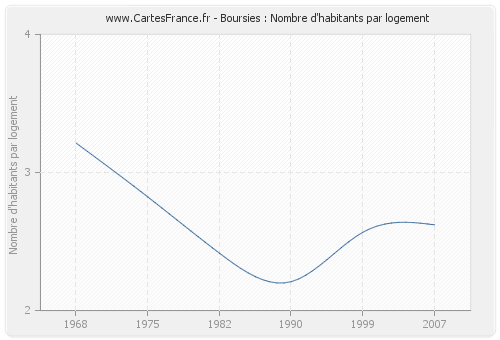 - Nombre d'habitants moyen par logement de Boursies en 2007 : 2,62