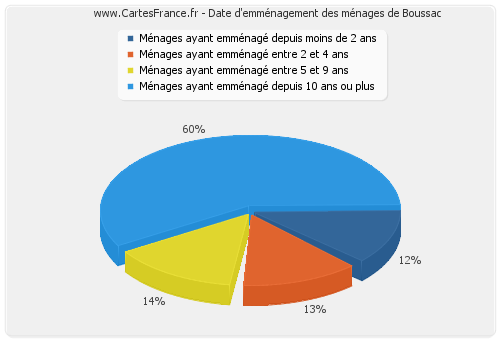 - Nombre de ménages de Boussac ayant emménagé depuis 10 ans ou plus : 121