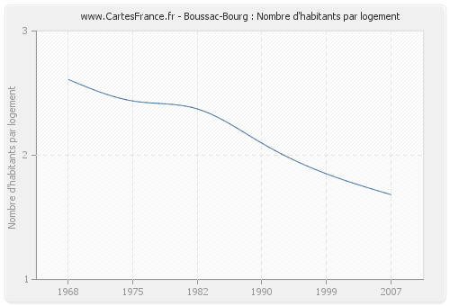 - Nombre d'habitants moyen par logement de Boussac-Bourg en 2007 : 1,68