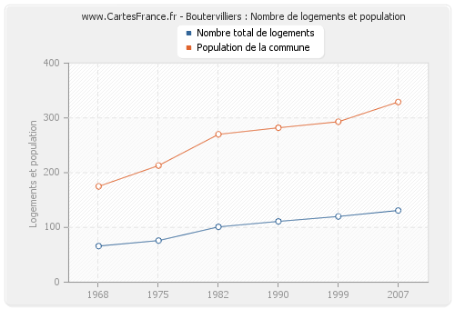 La population de Boutervilliers était de 329 habitants en 2007, 293 habitants en 1999, 282 habitants en 1990, 270 habitants en 1982, 213 habitants en 1975 et 175 habitants en 1968. Parallèlement, le nombre de logements de Boutervilliers était de 131 en 2007, 120 en 1999, 111 en 1990, 101 en 1982, 76 en 1975 et 66 en 1968.