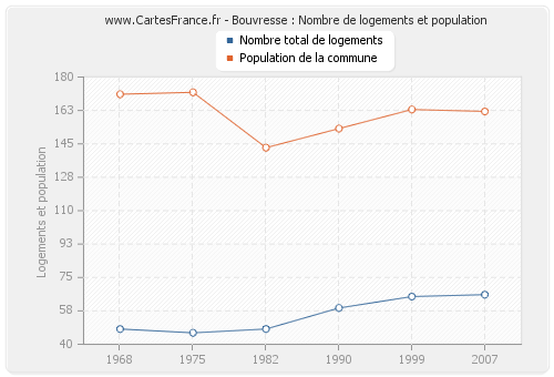 La population de Bouvresse était de 162 habitants en 2007, 163 habitants en 1999, 153 habitants en 1990, 143 habitants en 1982, 172 habitants en 1975 et 171 habitants en 1968. Parallèlement, le nombre de logements de Bouvresse était de 66 en 2007, 65 en 1999, 59 en 1990, 48 en 1982, 46 en 1975 et 48 en 1968.