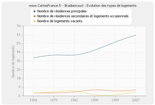 En 2007 les logements de Bradiancourt étaient composés de 61 résidences principales, 6 résidences secondaires ou occasionnels ainsi que 4 logements vacants.